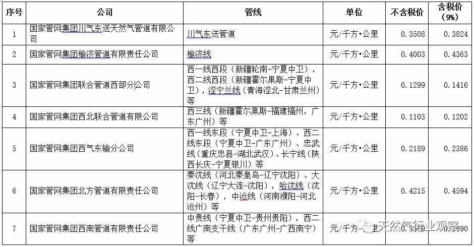 延伸1:國家管網天然氣管輸價格表