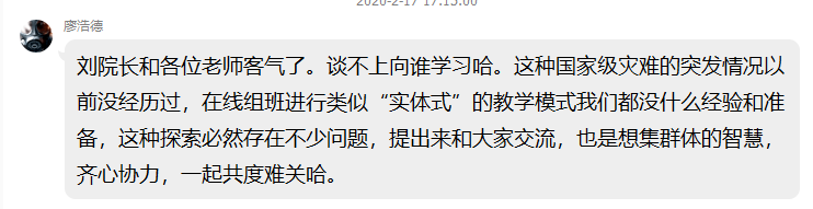 計(jì)科院廖浩德老師在得到學(xué)校將在新學(xué)期全面鋪開線上教學(xué)新模式以應(yīng)對新冠肺炎疫情的消息后,寒假期間沒有休息,于2月3日開始,率先開展了《計(jì)算機(jī)系統(tǒng)基礎(chǔ)》的在線教學(xué)活動。同時(shí),還將他的實(shí)施心得和思考與全院教師分享,展開了針對在線教學(xué)的大討論,為新學(xué)期全面開展線上教學(xué)提供了良好的思想基礎(chǔ)和寶貴經(jīng)驗(yàn)。據(jù)不完全統(tǒng)計(jì),學(xué)院已有4門課程已經(jīng)提前開啟了在線教學(xué),老師們充分利用在線直播軟件和課程平臺,開展了各種形式的教學(xué)、交流和指導(dǎo)工作,取得不錯(cuò)的效果。