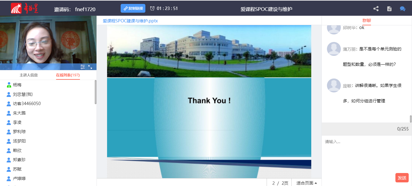 響應(yīng)學(xué)校的在線教學(xué)培訓(xùn)號召,2月23日我院楊梅老師在學(xué)校課程中心開設(shè)了“愛課程SPOC建設(shè)與維護(hù)”在線培訓(xùn)課程。在培訓(xùn)直播課程中,楊梅老師以中國大學(xué)MOOC(愛課程)平臺為例,就MOOC源課程與SPOC課程資源的區(qū)別與利用、SPOC課程維護(hù)與資源發(fā)布、設(shè)置討論與交流區(qū)、測驗(yàn)、考試、發(fā)布、截止等的進(jìn)行了詳細(xì)介紹,獲得了300多位參加直播培訓(xùn)老師的一致好評。