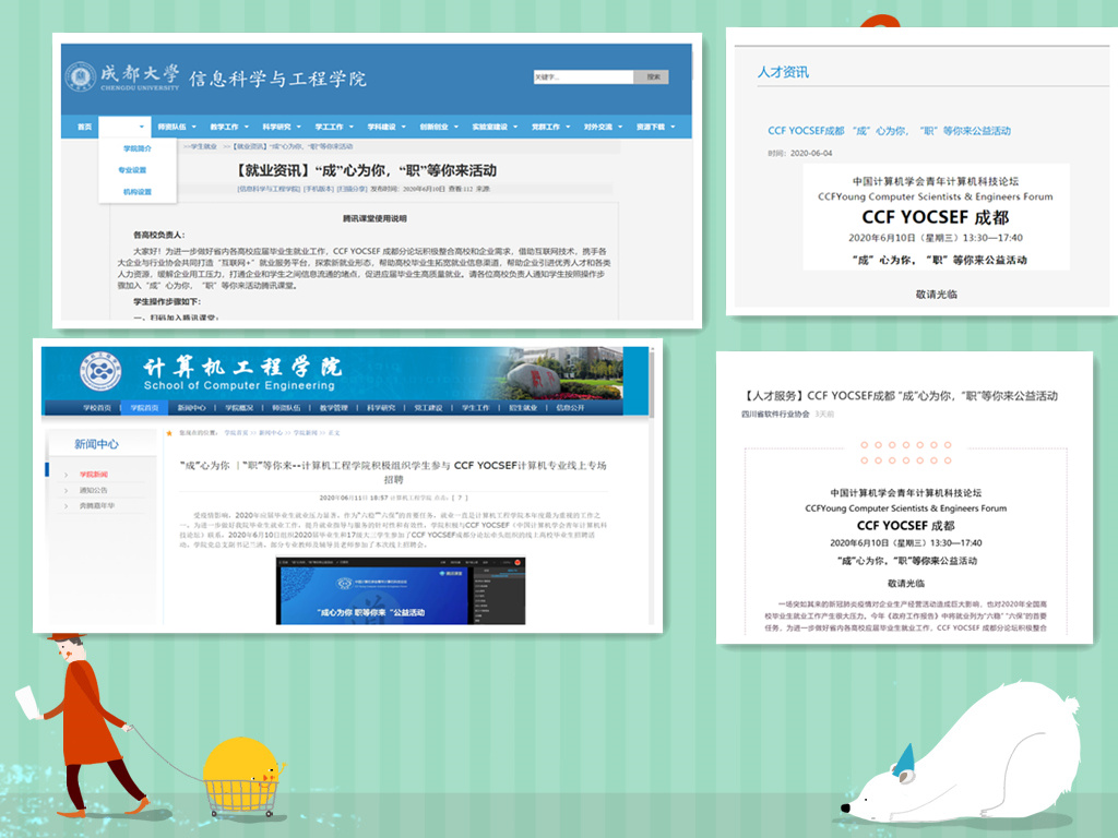 2020年6月10日,“‘成’心為你,‘職’等你來”公益活動線上開幕。電子科技大學信息與軟件工程學院黨委副書記、CCF YOCSEF成都2018-2019屆主席朱國斌以及西南石油大學計算機科學學院院長、CCFYOCSEF成都2019-2020屆主席王楊擔任活動執行主席,為企業代言,為高校學生尤其是應屆畢業生推薦就業崗位。