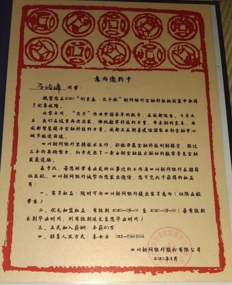 石峻峰同學獲得“新網銀行”20萬高薪Offer
