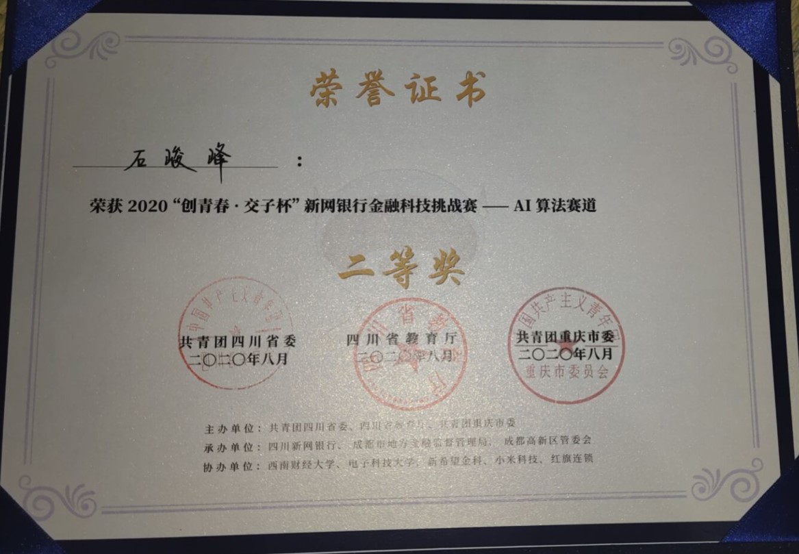 從21日11時到22日12時,在經過25小時晝夜不息的總決賽后,由計科院鄭德生老師指導的我院本科生石峻峰(2019級本科生)與另外三位其他高校的參賽選手閆強、唐靜、孫中宇一道,組建“TensorSlow開發組”戰隊,從電子科技大學、四川大學、華中科技大學等諸多名校以及來自騰訊和計算所等諸多企業的社會人士中脫穎而出,在AI算法賽道上獲得了初賽第一和決賽第二的優異成績,同時直接獲得了6萬元的獎金,并在現場拿到來自新網銀行的年薪20萬的高薪offer。