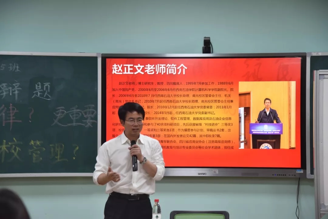 晚上19時20分,趙正文老師走進班會軟工專業2018級5班的班會教室,同學們全體自發起立,熱烈鼓掌歡迎,趙正文老師也向大家揮手致意,頻頻問好。班級主題班會由班長王儷穎主持。在嘉賓介紹環節,趙正文老師自報家門,強調是自己曾在計科院工作,跟大家“本是同根生”,既是大家的專業課老師,更是大家的大師兄,他希望自己能成為軟工1805班的一份子,趙正文老師詼諧幽默的一席話瞬間引得現場歡聲笑語不斷,瞬間拉近了師生間心的距離。