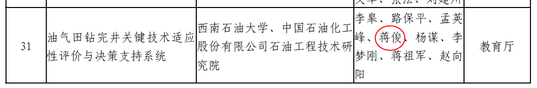 我校共有17項成果獲2020年度四川省科技進步獎,獲獎數量創歷史新高,其中由我校牽頭,我院教師蔣俊參與的《油氣田鉆完井關鍵技術適應性評價與決策支持系統》獲得2020年度四川省科技進步獎二等獎。