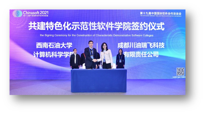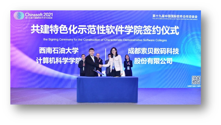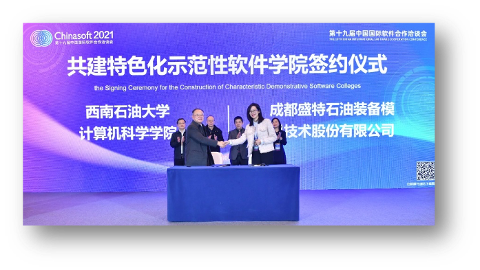 王楊代表西南石油大學計算機科學學院與成都盛特石油裝備模擬技術股份有限公司、成都川油瑞飛科技有限責任公司、成都索貝數碼科技股份有限公司完成共建特色示范軟件學院簽約儀式。