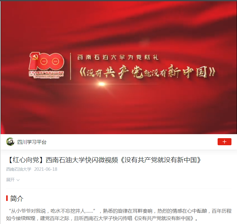 “從小爺爺對我說,吃水不忘挖井人……”,熟悉的旋律在耳畔奏響,熱烈的情感在心中醞釀,百年歷程如今接續輝煌,建黨百年之際,且聽西南石大學子快閃傳唱《沒有共產黨就沒有新中國》。