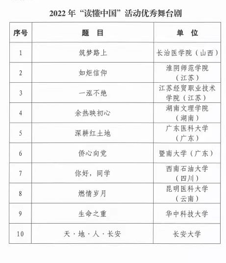 近日,2022年“讀懂中國”活動入選作品名單公布,南充校區(qū)學(xué)生創(chuàng)作的舞臺劇作品《你好,同學(xué)》榮獲“優(yōu)秀舞臺劇”稱號,學(xué)校關(guān)心下一代工作委員會獲表揚。