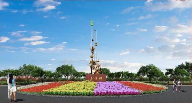 石油魂雕塑寓有“油氣之源”的象征意義,高聳的石油井架和管道,熊熊燃燒的火炬隱喻著蘊藏于大地之中的石油、天然氣資源的泉口,立足鉆井平臺、英姿勃發、向往未來的男青年,和懷抱書本、靜坐凝思、鉆研知識的女青年形象構成了動靜結合的整體,象征著有崇高理想、掌握科學技術的“四有”人才,也是祖國石油天然氣開發的力量源泉,從而達到自然與社會二者的有機統一。