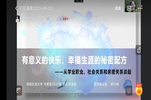 為了讓2022級本科新生調整心態,早日適應大學生活,在大學平臺展現風采,9月20日,我院在線上召開“有意義的快樂,幸福生涯的秘密配方——從學業職業、社會關系和親密關系談起”分享會。本次分享交流會由學校招生就業處專職咨詢師羅興婭主講,我院2022級全體同學參加。