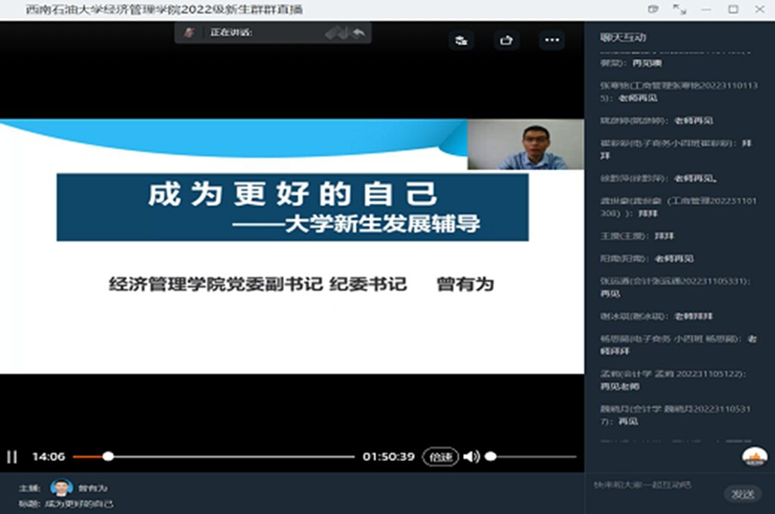 9月19日,經(jīng)濟管理學院舉行2022級新生入學教育系列活動之“成為更好的自己——大學新生發(fā)展輔導”報告會,報告會由學院黨委副書記、紀委書記曾有主講,全體2022級本科新生通過釘釘直播聆聽報告。