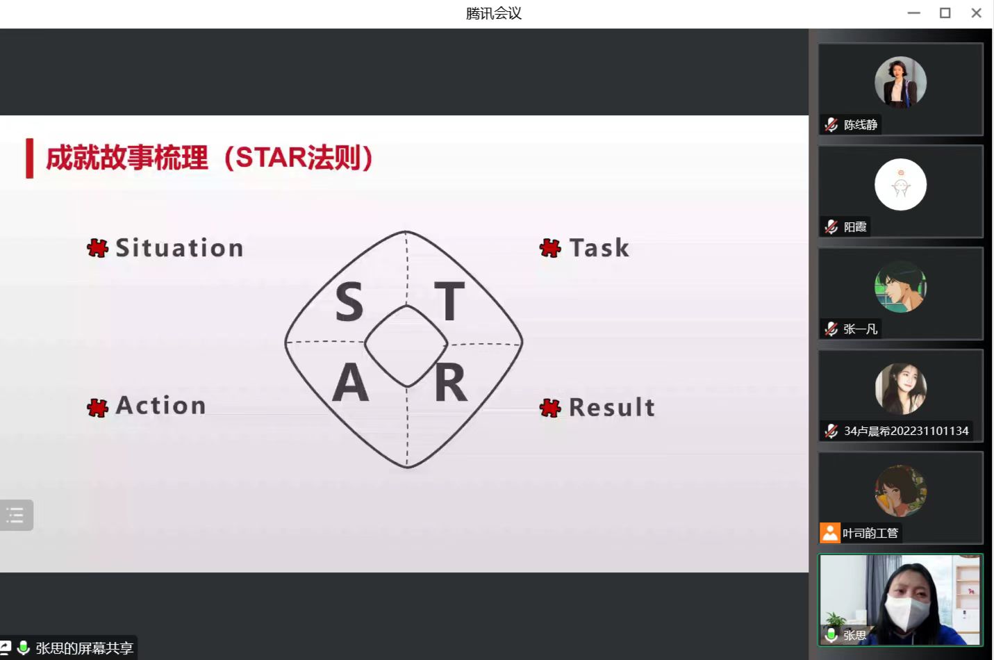 會議伊始張思談到臨淵羨魚或退而結網是同學們的兩種選擇,希望同學們在不同的經驗分享和講座中找準定位,“退而結網”,先從基礎做起。同時她呼吁大家進行期末的自我反思,鼓勵大家在未來的大學生活中要實現自我約束,促進自己的能力提升,抓住一切機會去豐富自己。隨后,張思通過向大家展示作弊的反面案例,告誡大家要誠信應考,“第一次參加大學的期末考試,更應該保持認真嚴謹的態度,不要作弊一時爽,學位火葬場”。最后,在即將迎來大學生活的第一個超長寒假之時,張思要求同學們保持積極學習的狀態以及良好的生活習慣,合理利用時間,利用假期發展自己。會議中她布置了一個假期小作業,希望大家用STAR法則來完成成就故事的梳理,以此反思和總結自己本學期的收獲。