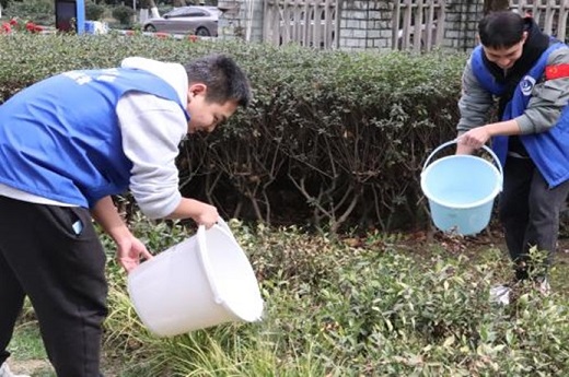活動現場的同學們熱情高漲、干勁十足,在各自負責的勞動區域內對花場環境開展衛生清理工作。他們身著藍色馬甲,滿懷勞動熱忱,在花場中用鐵鍬、鐵鏟等工具修整土地、夯實樹苗并拎桶澆水灌溉。活動期間,兩個專業的同學一邊清掃枯枝落葉、雜草雜物以及花叢中的煙頭紙屑,一邊交流著關于保護環境的經驗看法,現場一片熱火朝天。經過1個多小時的勞動,同學們讓學校社區環境更添生機,在春日里為校園植下了一抹亮色。