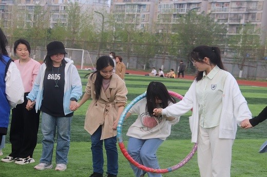 環環相扣這個趣味項目要求所有成員站成一排且手拉在一起,靠身體蠕動讓呼啦圈穿過所有人的身體。參賽隊員各顯神通,或從上至下以頭部肩部發力讓呼啦圈穿過身體,或從下至上先從腿部套進呼啦圈。隊員們冷靜沉著,場下的觀眾卻激動萬分,摩拳擦掌,躍躍欲試。