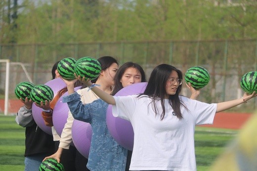 夾球運瓜項目率先開始,場上的同學們前后夾球并雙手拿瓜舉過肩上,在一二一的口號中向著終點邁進,加油聲、歡呼聲與口號聲混雜一起,場面火熱,歡笑連連。