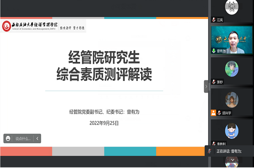 曾有為向同學(xué)們介紹了研究生綜合素質(zhì)測(cè)評(píng)框架、獎(jiǎng)助學(xué)金評(píng)定辦法,并詳細(xì)解讀了其指標(biāo)的具體構(gòu)成。他提到:“設(shè)置的評(píng)價(jià)標(biāo)準(zhǔn)是為了尊重差異、尊重個(gè)性,對(duì)同學(xué)們給予肯定,希望同學(xué)們積極參與校園活動(dòng)、提升學(xué)術(shù)水平和個(gè)人能力,在框架的指導(dǎo)下?lián)P長避短,突出核心競(jìng)爭力,實(shí)現(xiàn)差異化發(fā)展。”此外,曾有為指出,新生應(yīng)該仔細(xì)閱讀研究生手冊(cè),清楚學(xué)校規(guī)章制度,在研究生期間不斷完善自我。