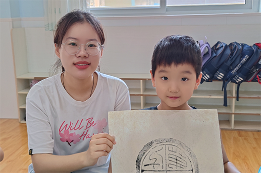 隨后,王老師詳細地向小朋友們介紹了木版印刷的流程,先研磨好墨,然后用刷子蘸取顏料,在已經刻好圖案的木版子上反復撣刷,最后將宣紙套印于木板上一會兒,“千秋萬歲”四字就躍然紙上,孩子們驚嘆到拓印技藝的高超與奇妙,并一一上前通過老師的指導制作出屬于自己的木板印刷作品。