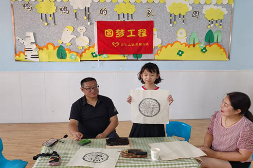 圖1 非遺傳承人傳授小朋友們木版印刷技藝