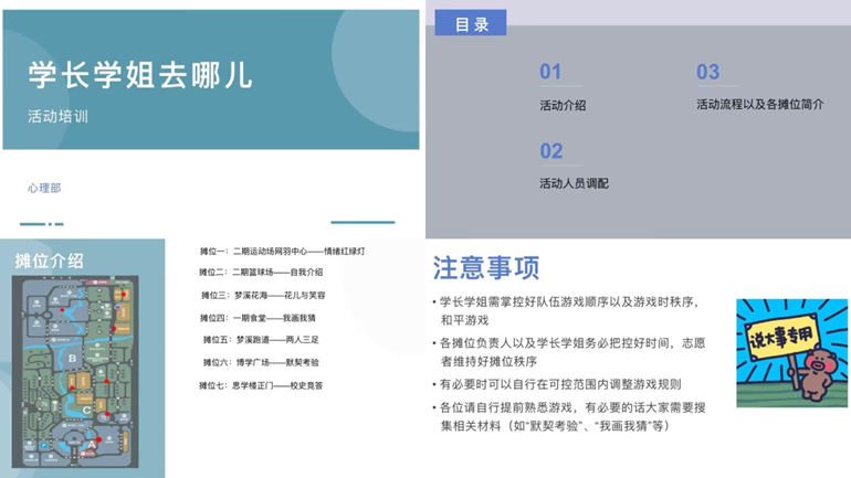 培訓開始前,活動負責人將同學進行分組調配,形成帶隊負責人和攤位負責人兩個隊伍。培訓過程中,主持人介紹本次闖關活動分為七個攤位游戲:情緒紅綠燈、自我介紹、花兒與笑容、我畫我猜、兩人三足、默契考驗和校史競答,接著講解了活動場地布置、集合時間和地點等有關事宜,最后重點演示了每個攤位的游戲規則:新生們依次進行闖關,闖關成功則在卡片上蓋章。
