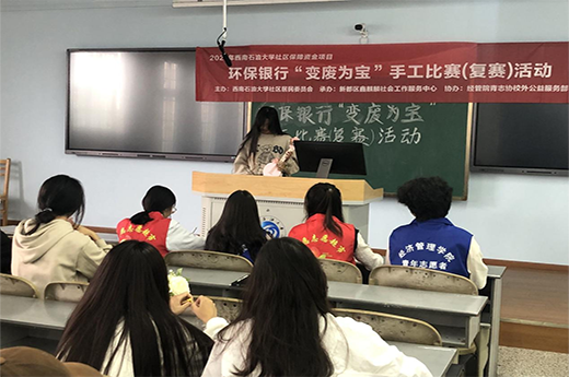 該活動是西南石油大學第十批大學生思想政治教育特色活動:攜手共建“環保銀行”,搭建志愿服務與勞動教育校園綠色發展平臺項目活動內容之一。本次手工比賽活動,既是西南石油大學對于國家綠色發展理念的積極響應,又是石大學子對于保護環境,綠色生活理念的積極踐行,相信在我們的未來生活中,綠色環保將真正走入群眾心中,成為每一位公民的自覺行動。