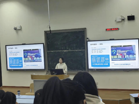 王銥鷺同學從自身參賽經(jīng)驗出發(fā),從競賽介紹、如何備賽、心得感悟等幾個方面為大家?guī)矸窒恚娬{(diào)了團隊協(xié)作和創(chuàng)新能力的重要性。