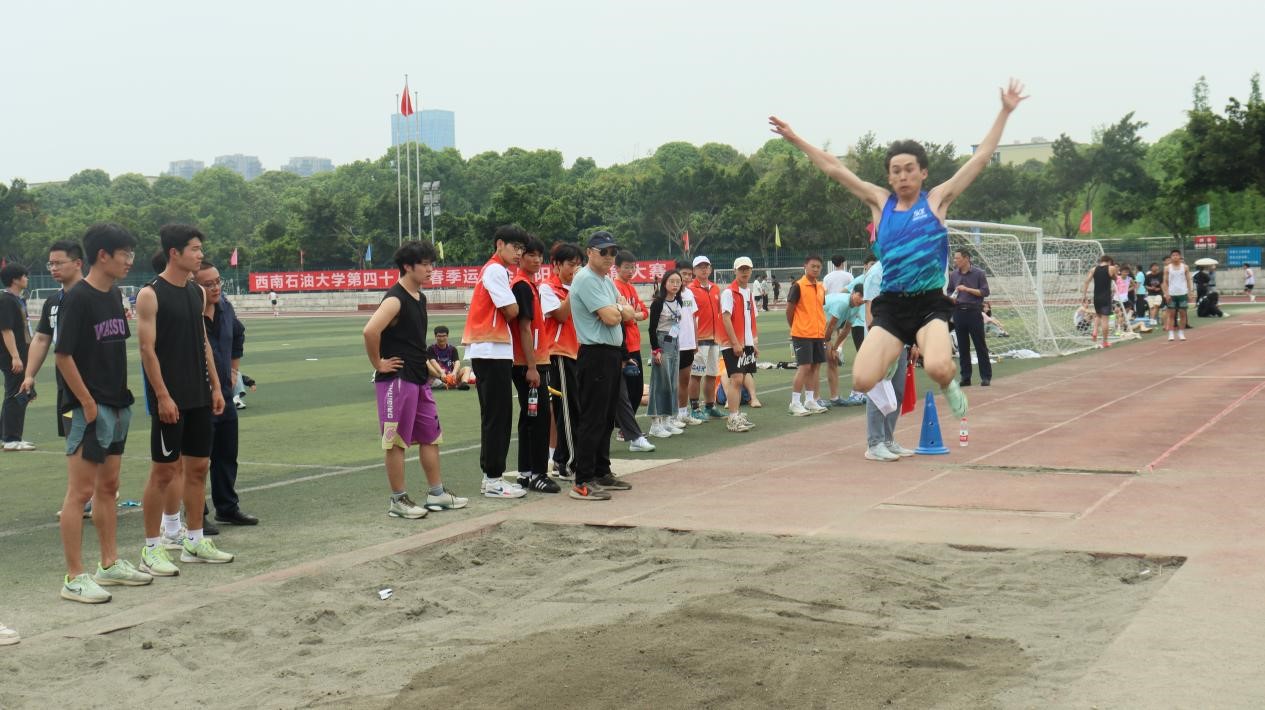 經濟學2021級的程瑩,自信地站在起跳線后,目光堅定地注視著前方的沙坑。她雙腿微微彎曲,一聲令下,身體騰空而起,在空中舒展著,猶如飛鳥一般。隨后,輕盈地落入沙坑,沙子被濺起,最終取得第三名的好成績。