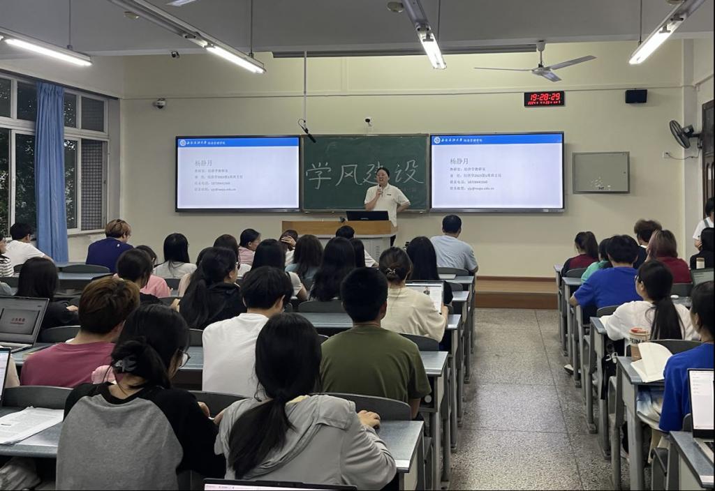 首先,主持人張奕羽介紹了學(xué)風(fēng)建設(shè)對(duì)于學(xué)生個(gè)人和學(xué)校整體的重要性,鼓勵(lì)我班每位同學(xué)積極參與其中。接著,一班和二班的學(xué)習(xí)委員總結(jié)了大一上學(xué)期我們?cè)谖乃圀w方面取得的各項(xiàng)成就,激勵(lì)大家繼續(xù)積極參加各項(xiàng)活動(dòng),提高了同學(xué)們的參與熱情。此外,她們還向我們介紹了能夠提高學(xué)習(xí)效率的具體方法,幫助同學(xué)們找到適合自己的學(xué)習(xí)方式,促進(jìn)班級(jí)學(xué)風(fēng)建設(shè)。然后,嚴(yán)雨楠同學(xué)向同學(xué)們提出幾個(gè)問(wèn)題,加深同學(xué)們對(duì)于“為何要加強(qiáng)學(xué)風(fēng)建設(shè)”和“怎樣加強(qiáng)學(xué)風(fēng)建設(shè)”的認(rèn)識(shí)。最后,班主任楊靜月向大家介紹了我們?cè)诟鱾€(gè)階段應(yīng)該做的事情,激勵(lì)同學(xué)們努力學(xué)習(xí)、積極參與各項(xiàng)競(jìng)賽,不斷提高自己的綜合素質(zhì)。