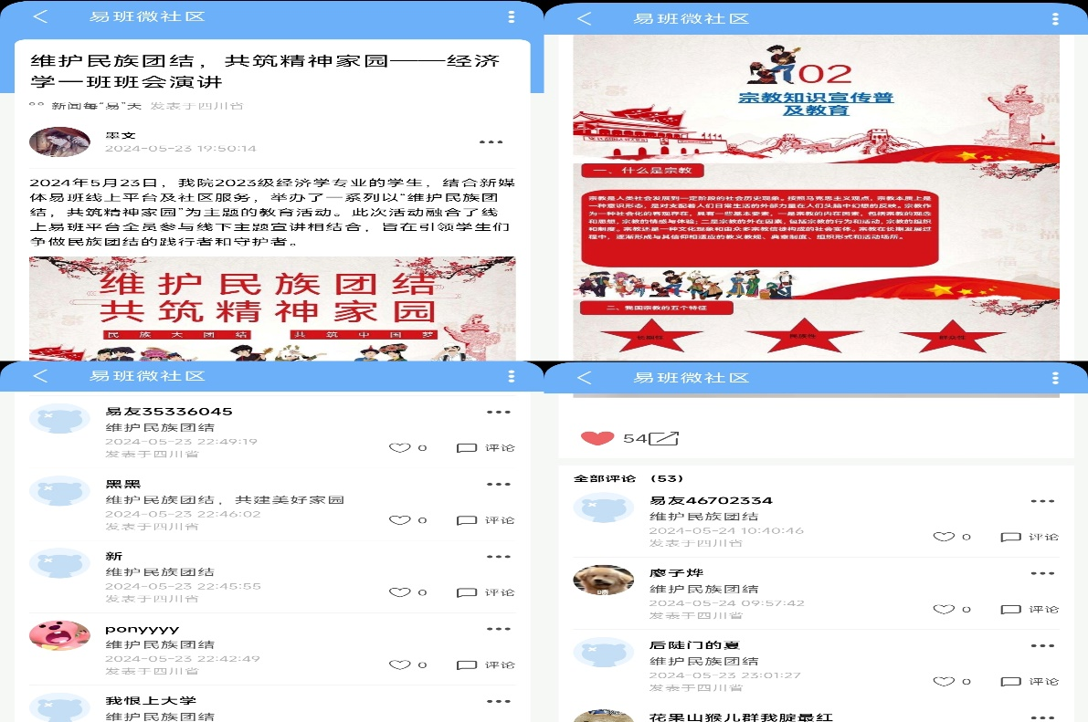 5月23日,23經(jīng)濟(jì)學(xué)專業(yè)在易班平臺成功舉辦了一場主題為“維護(hù)民族團(tuán)結(jié),共筑精神家園”的線上主題班會(huì)。此次活動(dòng)旨在加強(qiáng)學(xué)生們對民族團(tuán)結(jié)重要性的認(rèn)識,共同構(gòu)建和諧美好的精神家園。