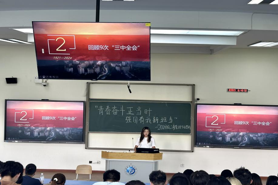 9月26日下午,我院2023級工商管理市場營銷專業在思學樓B210教室組織了一場以“學習黨的二十屆三中全會精神,爭做合格社會主義合格接班人”為主題的學習交流會。此次會議旨在深入理解黨的發展歷史與精神內涵,回顧了歷次重要的三中全會,并重點探討了最近一次三中全會的精神實質及其對當代青年大學生的啟示與指導意義。