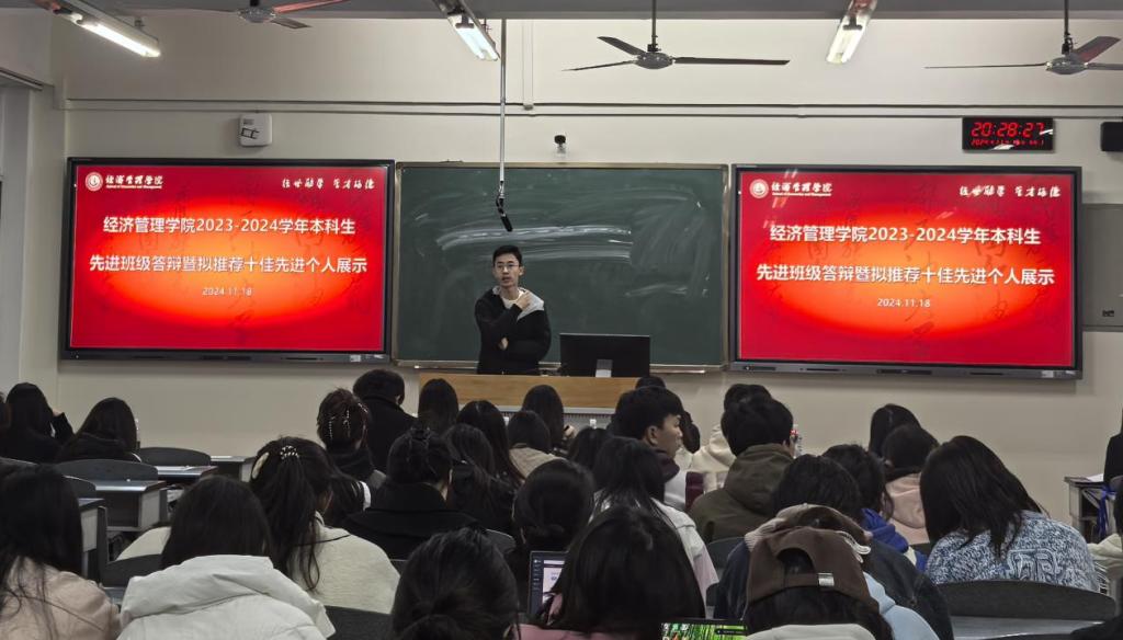 2023級工商管理二班、2023級國際經(jīng)濟(jì)與貿(mào)易二班、2022級市場營銷一班等11個班級代表參與本科生先進(jìn)班級答辯會。各班分別展示了班級制度創(chuàng)建、網(wǎng)班建設(shè)情況、學(xué)風(fēng)建設(shè)以及班級榮譽成果,從中不僅看到了創(chuàng)新性的管理機制還體現(xiàn)出了各班對于德智體美勞的全面發(fā)展的重視。