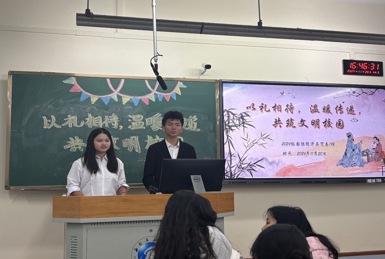 2024年11月20日下午,國際經濟與貿易2024級1班在博學樓B206教室成功舉辦了一場別開生面的主題班會,主題為“以禮相待,溫暖傳遞,共筑文明校園”。此次班會內容豐富、形式多樣,有力推動了校園文明禮儀建設。本次班會由班長馬犇、黃婷婷主持,各班委合理分工,使整個班會井然有序,展現出國貿2024級1班班委積極的工作態度和有力的團隊合作。