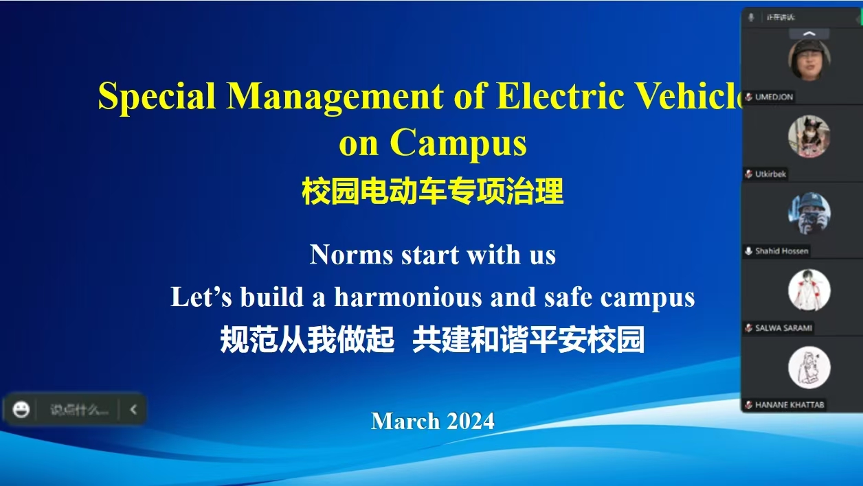 為積極響應學校關于加強校園安全管理、營造和諧平安學習環境的號召,經濟管理學院面向我院各年級國際學生于3月7日于騰訊會議線上舉辦了以“規范從我做起,共建和諧平安校園”為主題的校園電動車專項治理宣講班會。此次活動旨在提升我院國際學生對校園電動車規范使用的認識,強化安全意識,共同維護校園交通秩序與安全。