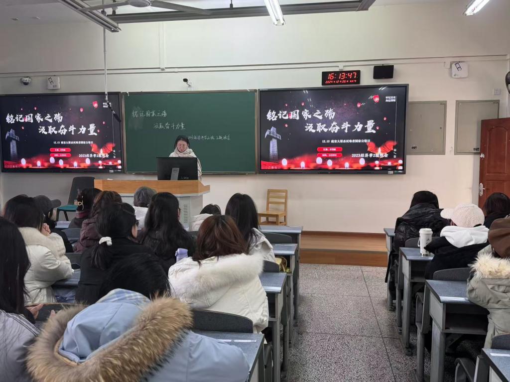 銘記國家之殤,汲取奮斗力量。付雪麗帶領(lǐng)同學(xué)們回溯南京大屠殺黑暗的歷史背景,緬懷南京大屠殺遇難同胞,并展示歷史資料和前輩英勇事跡,寄托對(duì)逝者的哀思,表達(dá)對(duì)歷史的敬畏。國家舉行公祭活動(dòng),是為了教育年輕一代,讓大家了解歷史真相,珍惜和平,為傳播和弘揚(yáng)愛國主義精神貢獻(xiàn)青年力量。