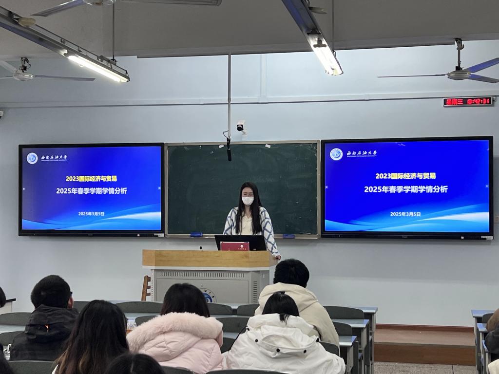 2025年3月5日,國際經濟與貿易專業2023級全體同學在博學樓A206教室召開了新學期第一次主題班會。本次班會圍繞“學業規劃”與“安全法紀健康”兩個主題展開,旨在總結過往學習成效、明確學業目標,同時強化學生安全意識與規則意識,為新學期學習生活奠定堅實基礎。輔導員李晨老師主持會議。