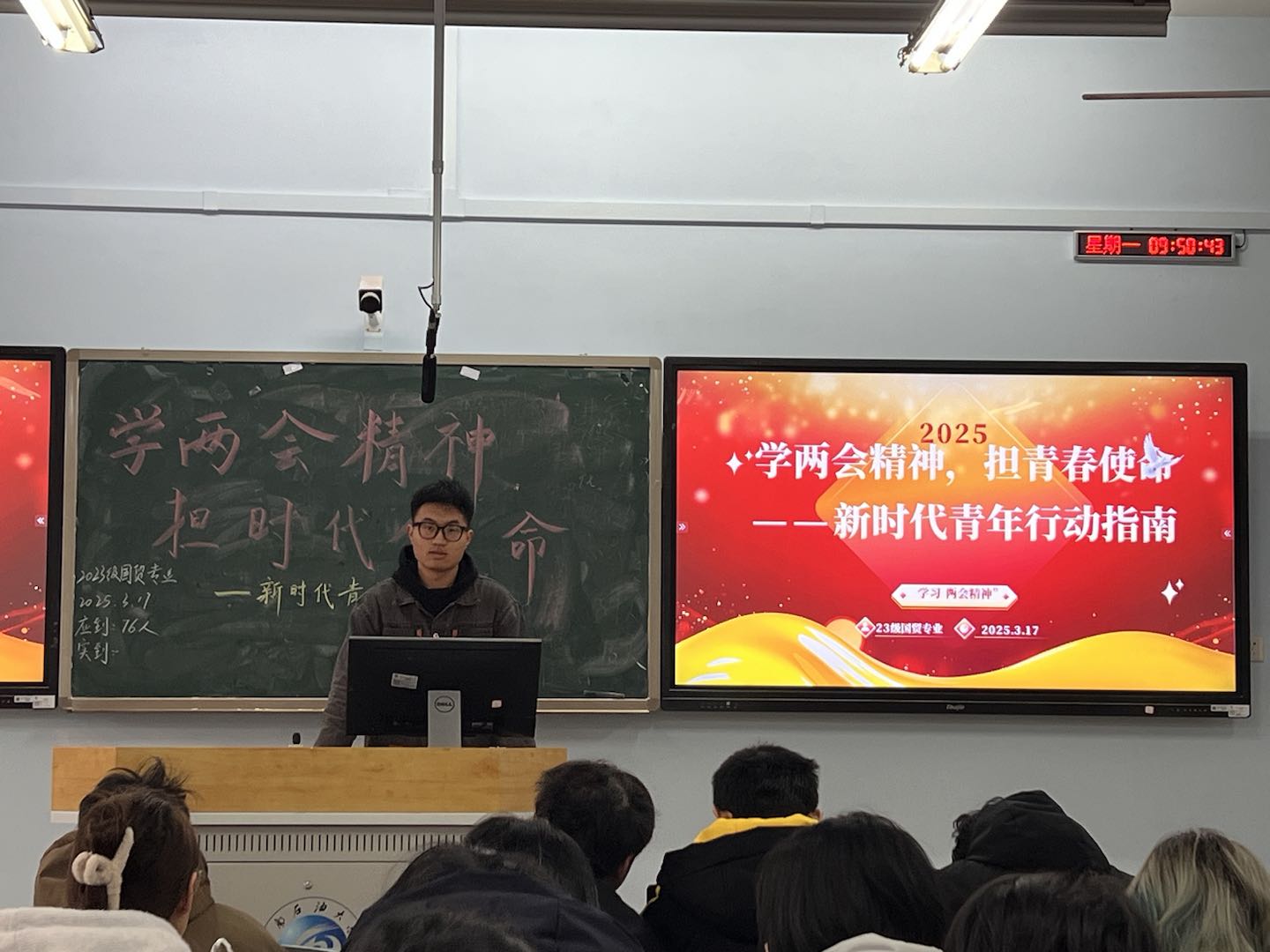 為深入學習貫徹2024年全國兩會精神,引導青年學子厚植家國情懷、勇擔時代使命,深化其對“兩會精神”的理解,激發當代大學生奮進新征程的責任感與使命感,2023級國際經濟與貿易專業于3月17日在博學樓A206組織開展了“學兩會精神,擔時代使命——新青年的行動指南”主題班會。班會由宣傳委員米靜文同學主持,全體學生參與。