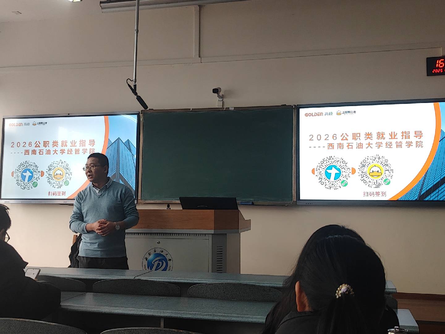 2025年3月20日,學院邀請高頓上岸鴨公考四川研究院、高頓CDC職業發展中心的資深講師熊榮,為我院學子深刻而全面的講解了有關公務員考試以及體制內就業的有關情況。