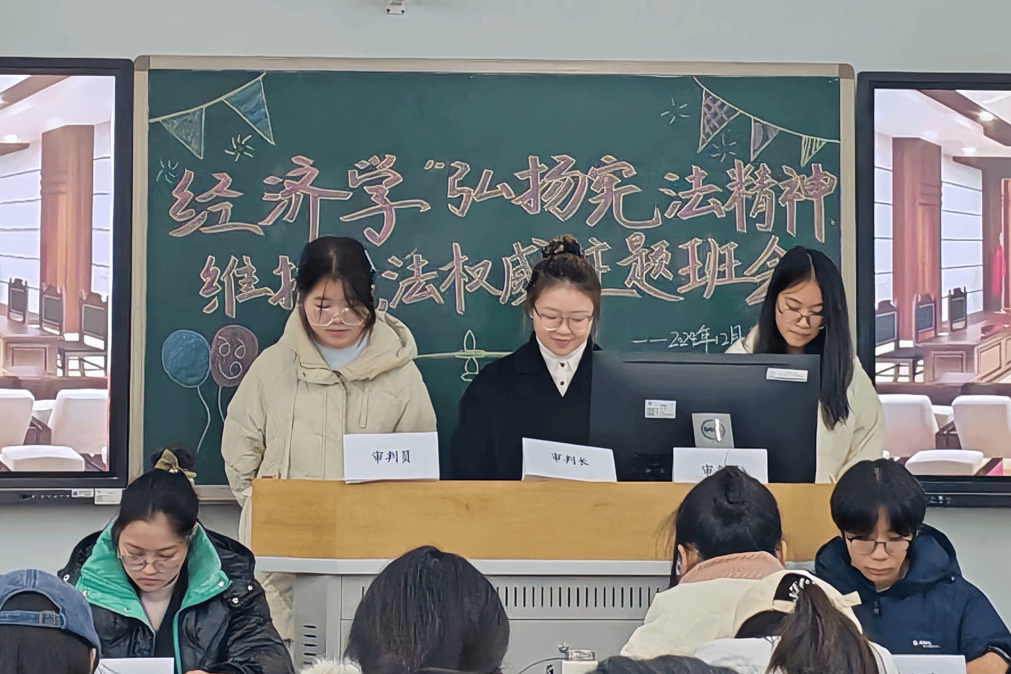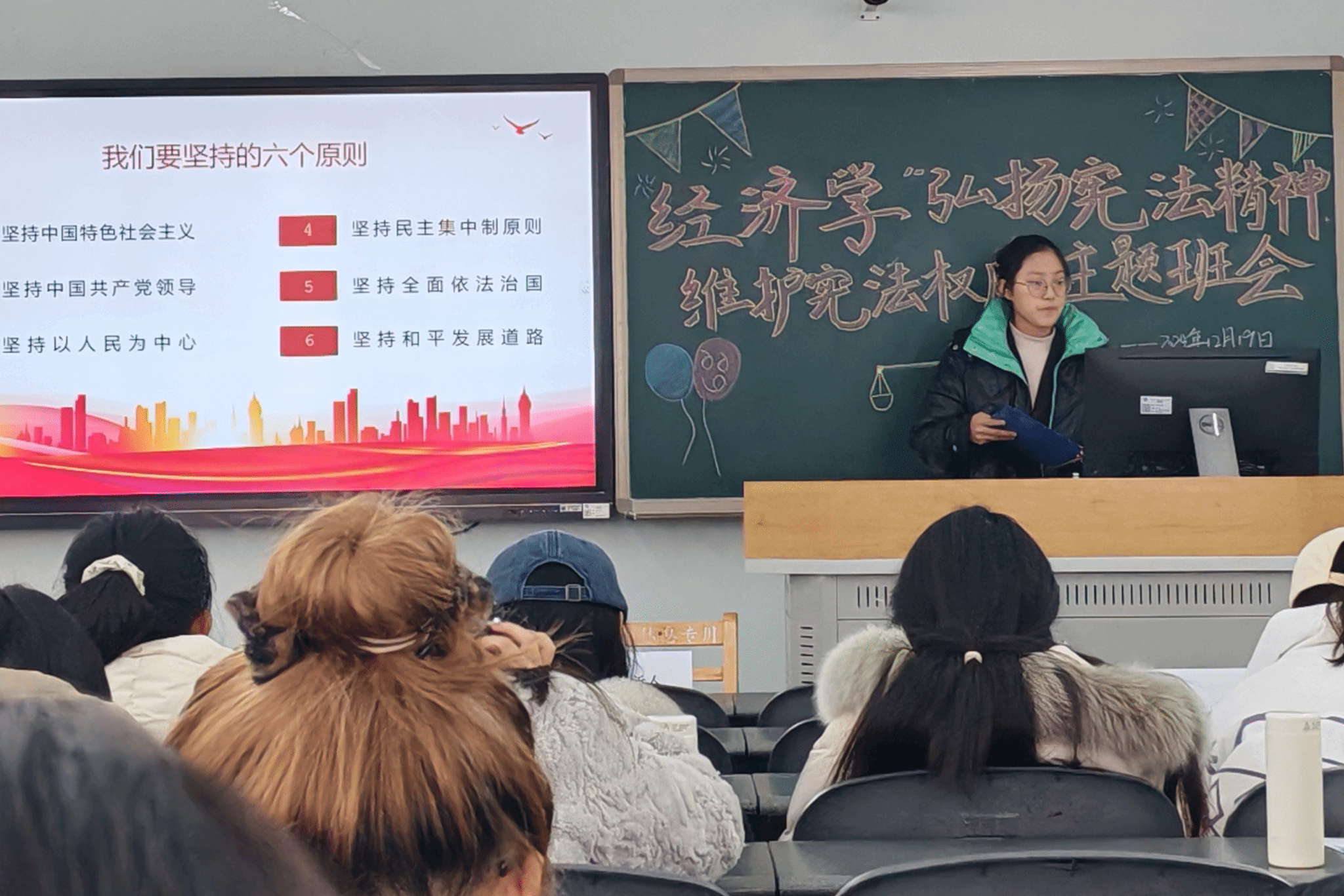 12月19日,經(jīng)濟(jì)管理學(xué)院2024級(jí)經(jīng)濟(jì)學(xué)專業(yè)在思學(xué)樓A311教室舉行了一場(chǎng)以“弘揚(yáng)憲法精神,維護(hù)憲法權(quán)威”為主題的班會(huì)活動(dòng)。此次班會(huì)旨在增強(qiáng)同學(xué)們的憲法意識(shí),促進(jìn)對(duì)憲法精神的深入理解和踐行。班會(huì)由一名主持人精心策劃并主持,活動(dòng)內(nèi)容豐富,形式多樣,吸引了全班同學(xué)積極參與。