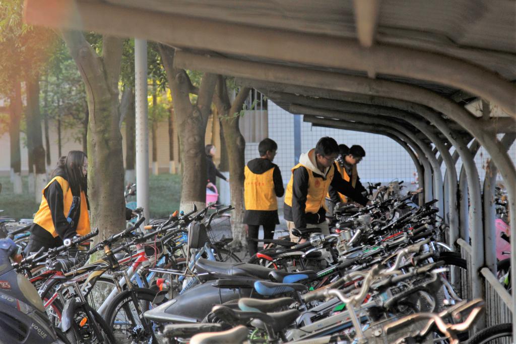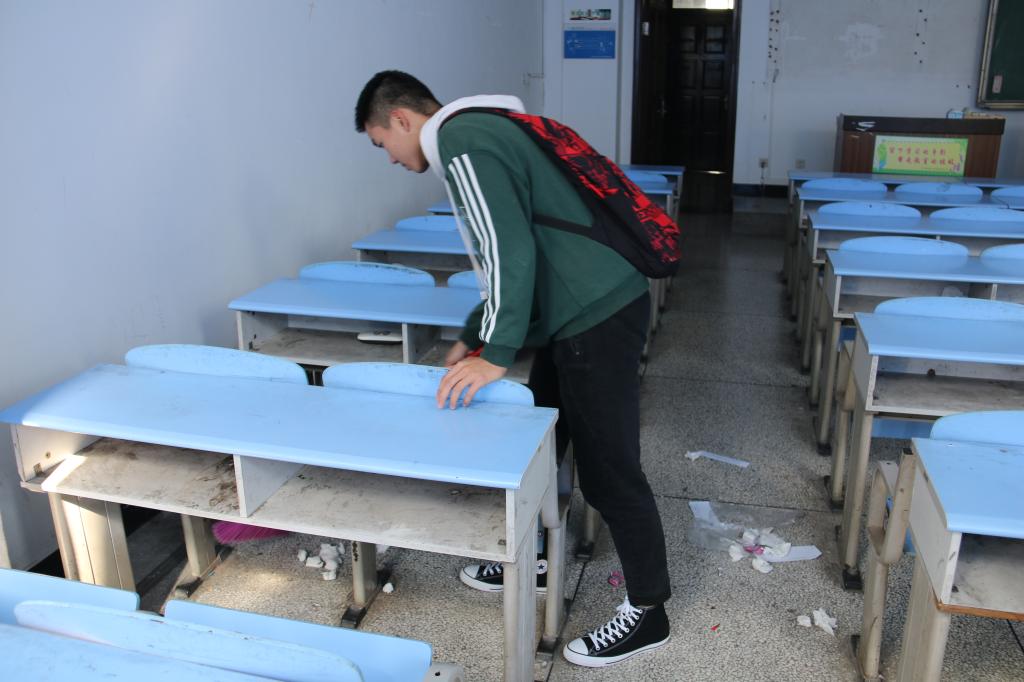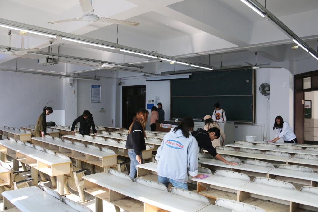 勞動過程中,同學們不怕臟不怕累,積極行動,分工合作。掃地,拖地,擦黑板,擦桌椅,彰顯了“愛校如家”的良好精神風貌,用自己的雙手建設出了窗明幾凈、環境優美的校園環境。校青志協、各學院青志協高擎志愿服務大旗,在各自的清潔區積極開展校園衛生清掃、單車整理、看臺維護等工作。身著黃馬甲的“小黃人”成為了教學樓、學子感恩林、自行車停靠區、足球場等校園角落里最靚麗的一道風景線。