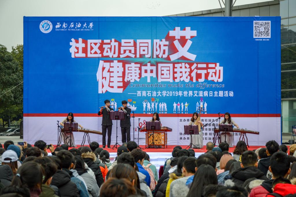 11月 28日下午,“社區動員同防艾,健康中國我行動”艾滋病日主題宣傳教育活動在博學廣場舉行。副校長巫曉兵、省教育廳體衛藝處調研員盧旭、成都市新都區衛生健康局副調研員彭仕江、校團委書記夏艷、保衛處處長鄧洪波、學生工作部副部長陳俐紅、新都區疾控中心副主任黃智芬、校醫院直屬黨支部書記游麗、校醫院院長張繼紅、新都區疾控中心重大傳染病防治科科長梁海東出席活動,全校400余名青年學生參加了本次活動。