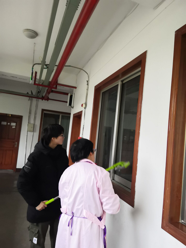 小理事在護工的指導下打掃衛生 (羅程\攝)