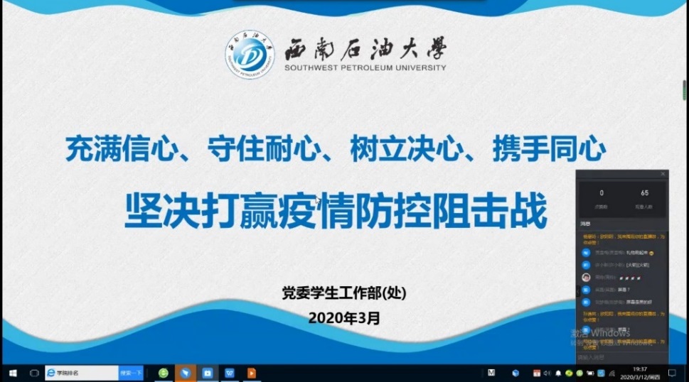 首先,同學們在線上一起學習了習近平總書記給在首鋼醫院實習的西藏大學醫學院學生的回信,奮戰在抗疫一線的醫護工作者體現的使命與擔當,極大的鼓舞了大家。在應對疫情方面,班會向同學們傳達了全國抗擊新型冠狀病毒肺炎疫情的一些重要信息,介紹了學校在疫情的特殊情況下全力推進的各項工作,引導大家正確對待疫情。當前疫情防控仍然處于關鍵時期,疫情風險和防控工作都尚未解除,提醒同學們不可麻痹大意,更不能放松警惕,絕不能有絲毫松懈。同時,同學們要認真完成線上學習任務,充分利用學校搭建的云平臺,此外,加強體育鍛煉,積極配合并嚴格遵守學校發布的防疫要求和相關規定,誠信報告健康信息。
