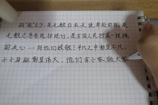 此刻,身處陜西省西安市的17級電商專業的張思思同學正在家中觀看晚會,在面對新冠肺炎時,數名天府兒女主動請纓,勇敢逆行的場景讓她聯想到了學校這次參與志愿服務的同學們,在疫情來臨時,他們主動報名參加社區志愿服務,分發口罩、幫助居民采購生活日用品、協助社區工作人員登記疫情相關信息……這些都是他們的日常工作,他們也在為打贏這場疫情防控阻擊戰貢獻自己的力量。疫情期間,張思思也參與了志愿服務工作,如果有機會,她希望能再多做一些,在國家的危急時刻多盡點綿薄之力。
