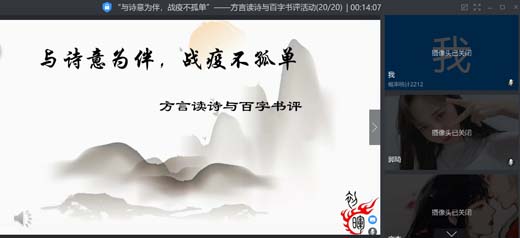 通過視頻會議的方式,此次活動方言讀詩與書評分享交替進行。同學們用四川、河南、天津等地方方言描繪出詩歌嶄新的面貌,也借由自己的感悟與評論,將《偷影子的人》、《烏合之眾》等優秀作品帶入了大家的視野,并幫助大家了解這些優秀的文化作品。活動過程中,借助麥克風,各人員更近距離地傾聽到彼此;在部分選手未能到場的情況下,采取音頻直接投放的形式;設立專業評審團加大眾投票的互動模式,展現出線上活動別開生面的景象。