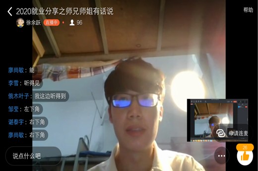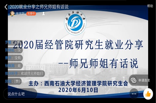 2020年6月10日下午16點,2020屆我院研究生就業分享交流會在輔導員徐余躍和我院研究生會的組織安排下成功舉辦,此次會議旨在通過畢業生就業經驗分享讓2018級、2019級研究生提前熟悉求職就業相關事項。