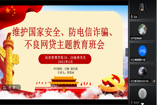 為提高大學生的國家安全意識、風險意識、反間諜意識、保密意識和政治警覺,防范金融陷阱,增強自我保護能力,4月16日19時,我院2019級和2020級全體研究生開展了“維護國家安全、防范電信詐騙和不良貸款”線上主題教育班會。