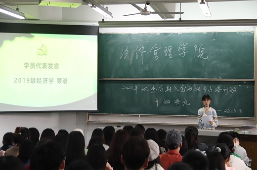 儀式開始,2021級物流工程與管理專業(yè)歐陽運(yùn)佳作為學(xué)生黨員代表發(fā)言。她講述了自己在黨組織的教育培養(yǎng)下,認(rèn)真學(xué)習(xí)黨的理論知識,不斷提高自身思想政治覺悟,成為一名優(yōu)秀黨員的成長經(jīng)歷。她結(jié)合自己的經(jīng)歷告誡學(xué)員們:所有入黨積極分子應(yīng)認(rèn)識到自己身上的責(zé)任、肩上的重?fù)?dān),用理論武裝頭腦,用行動踐行初心。2019級經(jīng)濟(jì)學(xué)專業(yè)顧洛作為本期培訓(xùn)班學(xué)員代表發(fā)言。她表示:作為我院入黨積極分子,她將以飽滿的熱情完成黨課學(xué)習(xí),嚴(yán)格遵守黨章黨紀(jì),同時,也希望全體學(xué)員以黨員的標(biāo)準(zhǔn)嚴(yán)格要求自己,不斷提高政治素養(yǎng)和黨性修養(yǎng),時刻牢記為民初心。