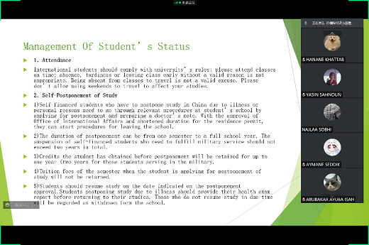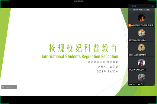 為幫助同學們充分了解學校各項規定,加強校規校紀教育,適應西南石油大學的新生活,西南石油大學于2021年11月30日晚以線上會議形式開展留學時大講堂之校規校紀教育。本次會議由國際經濟與貿易2020級留學生班導生呂玥萱同學主講,2021級29位留學生人參加會議。