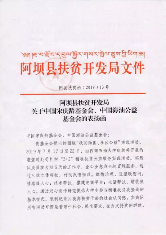 近日,中國宋慶齡基金會收到四川省阿壩藏族羌族自治州阿壩縣扶貧開發局的來函,表達對中國宋慶齡基金會、中國海油公益基金會共同發起的“扶貧助困、社區公益”主題公益實踐項目和在當地茍扎村開展扶貧活動的西南石油大學經濟管理學院學生團隊“耄耋通”的感謝之情。