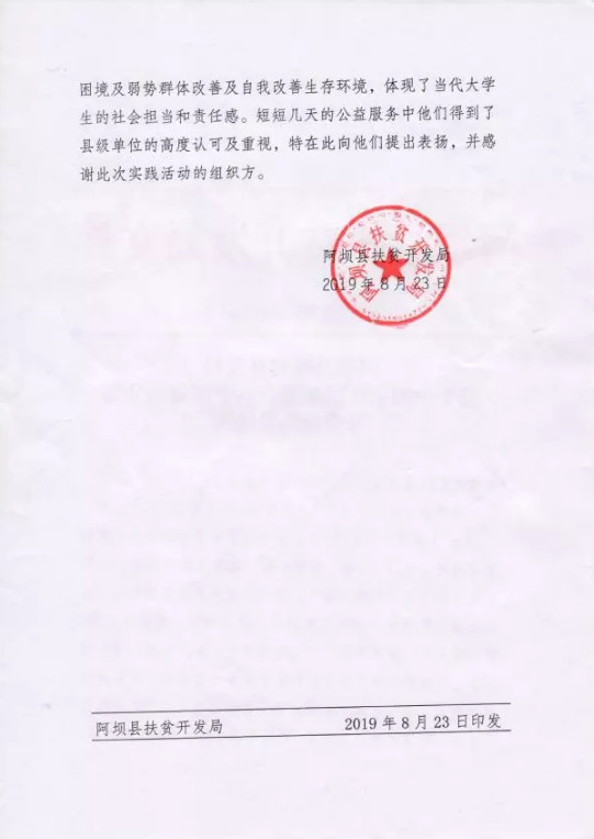 “……實踐隊所有活動可謂是著眼于社會、民生需求,全力支持貧困群體、困境及弱勢群體改善及自我改善生存環境,體現了當代大學生的社會擔當和責任感。……特在此向他們提出表揚,并感謝此次實踐活動的組織方。”