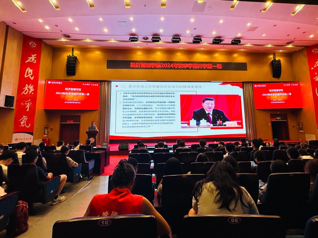 學院黨委副書記、紀委書記羅昌龍主持開學第一課,全體學工隊伍以及各專業年級學生代表500余人參加活動。