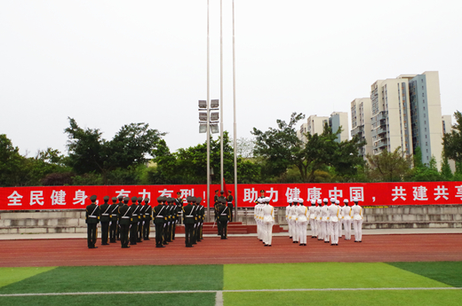 踩著鼓點(diǎn),邁著整齊的步伐,國(guó)旗護(hù)衛(wèi)隊(duì)精神抖擻,護(hù)送國(guó)旗進(jìn)入人們的視野。嘹亮的國(guó)歌響徹運(yùn)動(dòng)場(chǎng),五星紅旗在大家的注目禮中緩緩升起。